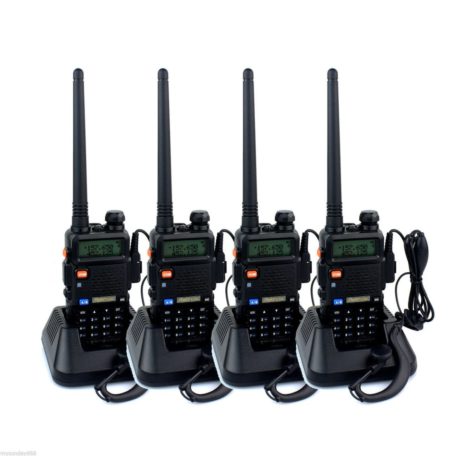 The RT-XD is an amazing professional walkie talkie, operating on UHF and VHF. With 128 channels, you can ensure interference-free communications throughout your 50,000 sf. indoor or large outdoor haunt. Also has built-in flashlight and radio. Excellent battery power will last for days without recharging. Dual bands allow you to operate two channels at once, switching between frequencies with a push of a button. Includes rechargeable battery, charger and earpiece. It is splashproof and durable. Add 2-year warranty for an additional $10 per unit.” $59.95/ea. 12 for $599.95, 20 for $799.95.