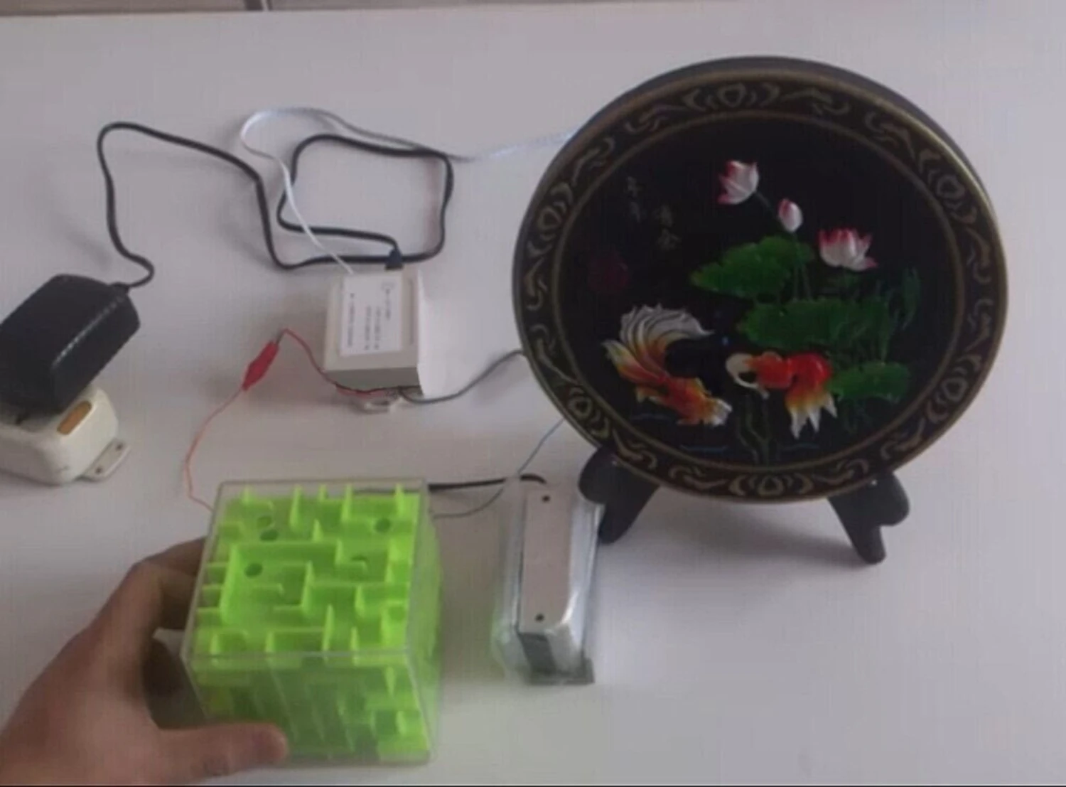 Players must rotate the three-dimensional transparent cube maze so that the ball can make its way through to the exit. Once the ball is retrieved it must be placed on the disc-shaped decoration as the fish’s eyeball in order to open the lock.