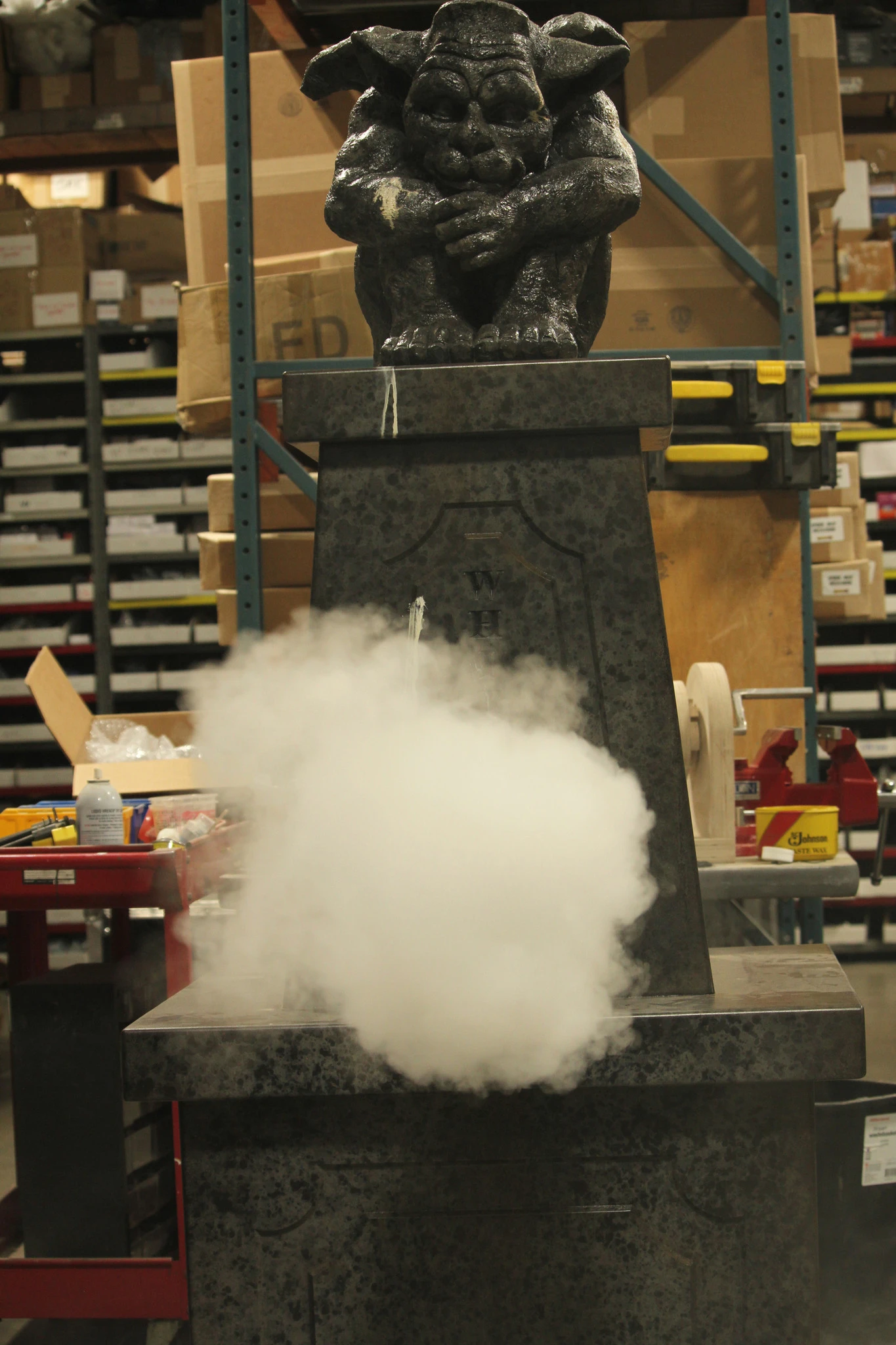 This statue is built and painted by hand, by haunters for haunters. The back of the prop is left open allowing easy access to the fog machines and their reservoirs. The statue’s base also contains hidden wheels to make transporting this large, heavy prop deceptively easy.
