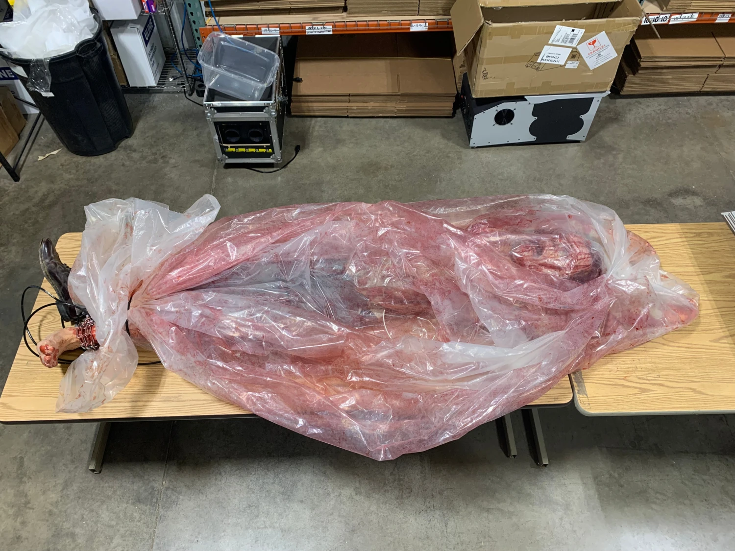 This gory mech hangs up side down by its chained feet. The life sized dummy is nearly 7 feet long with its arms dangling above its head. While eerie on its own, when hooked up to an air compressor this prop comes takes it to the next level by coming to life and flailing away from inside its bloody body bag.