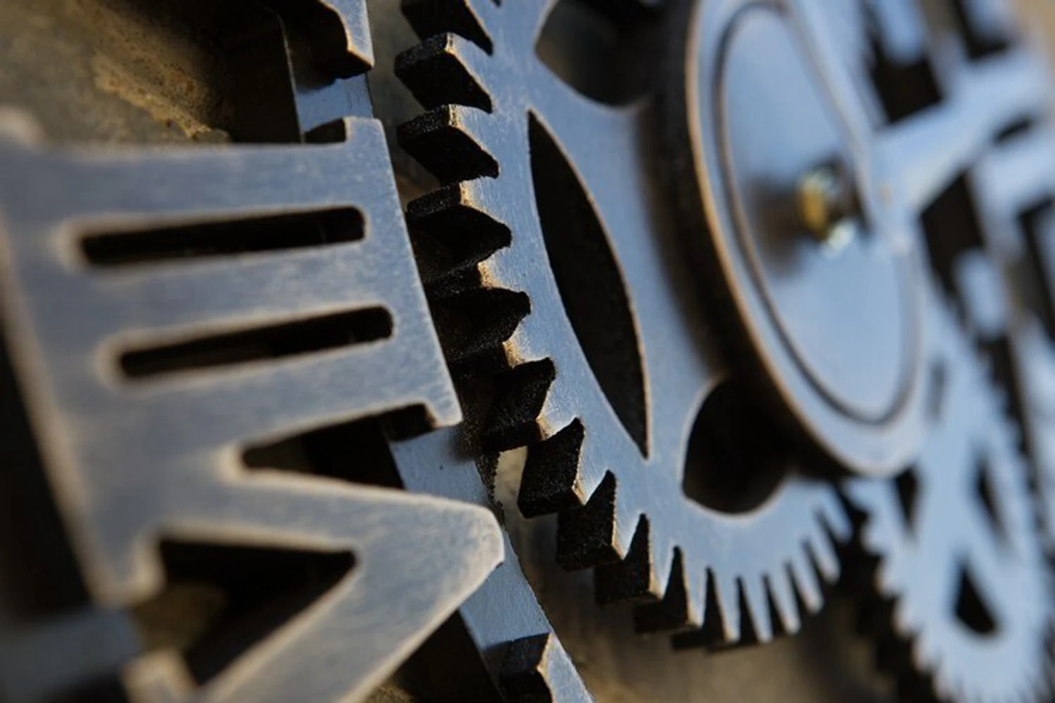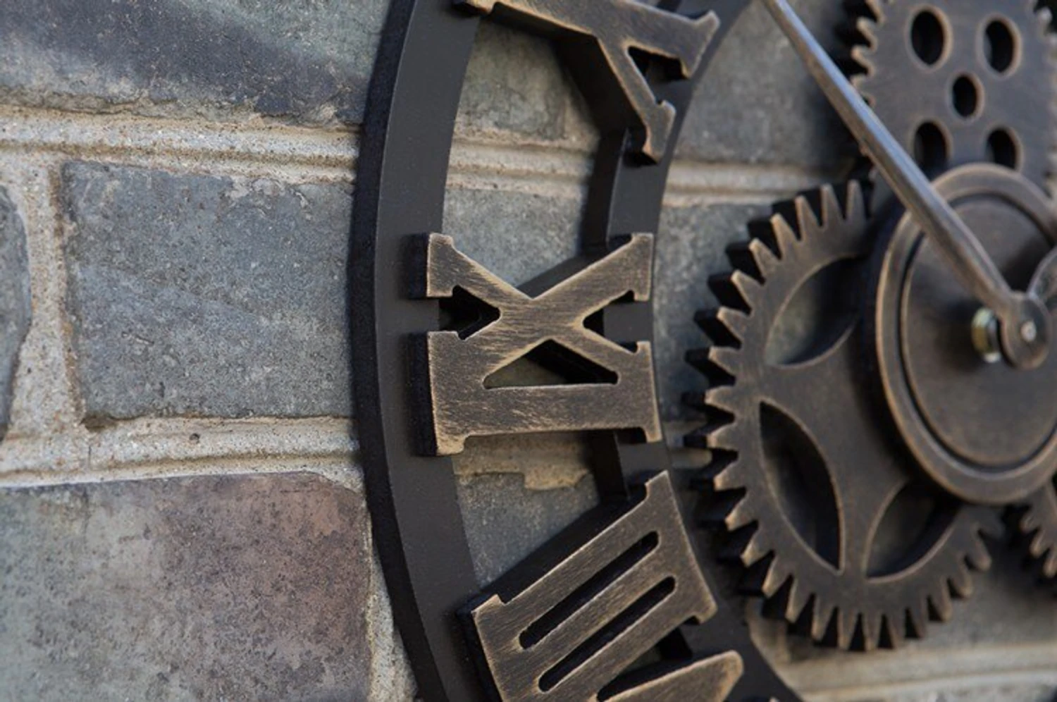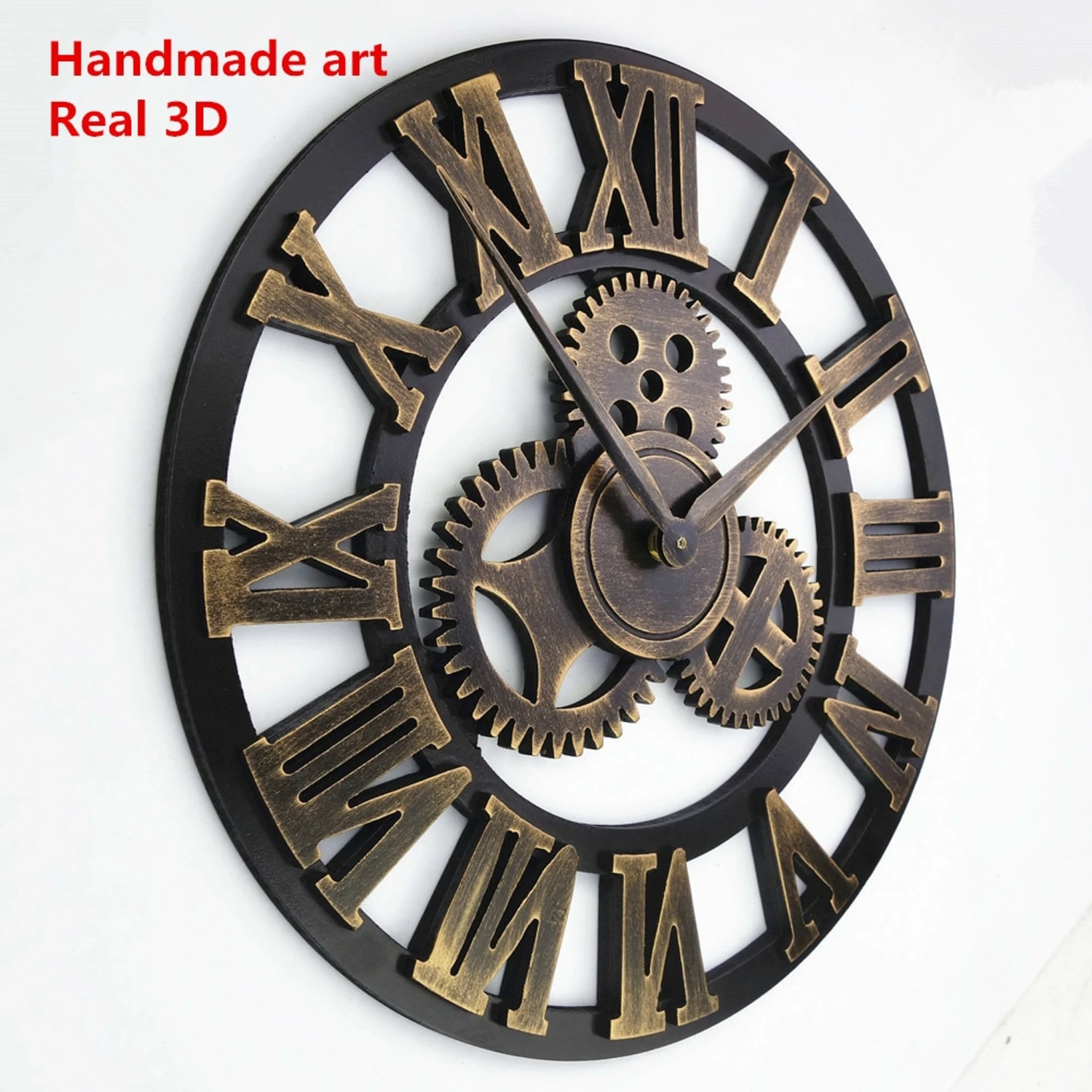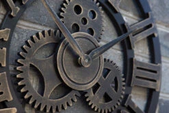 This is a handmade large vintage-style decorative wooden wall clock designed with a big gear decoration and full of metallic texture, art, and industrial framing.