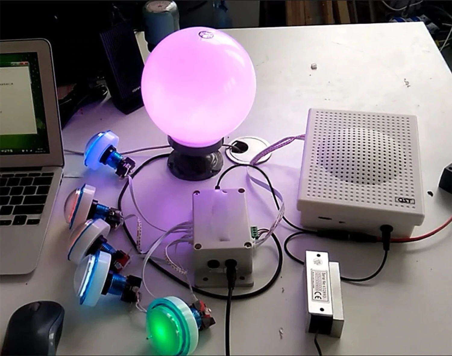 The LED sphere will light up 15 different colors randomly. Each of the 5 accompanying LED buttons will light up different different colors as well. Players must press the colored buttons at the moment they match up in color to the sphere. When players connect the parallel sphere by hitting all 5 buttons while they match up, the lock will open.