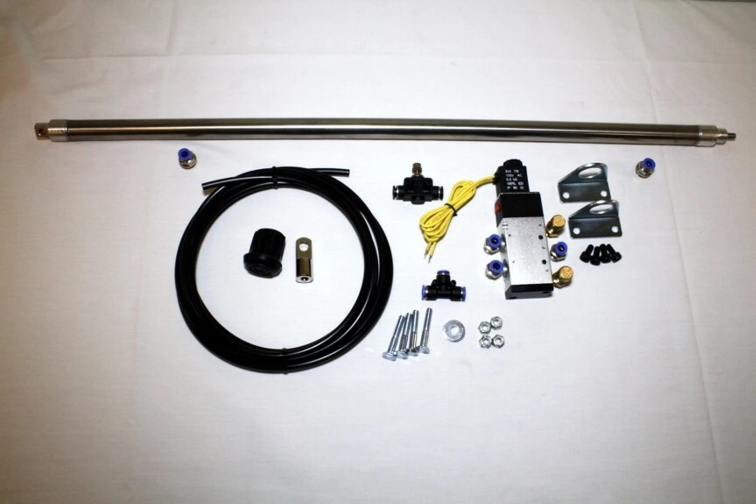 Extra long shaft cylinder allows you to use many different sizes of creatures in your barrel. Includes all mounting brackets, bolts, cylinder, solenoid, tubing and fittings.