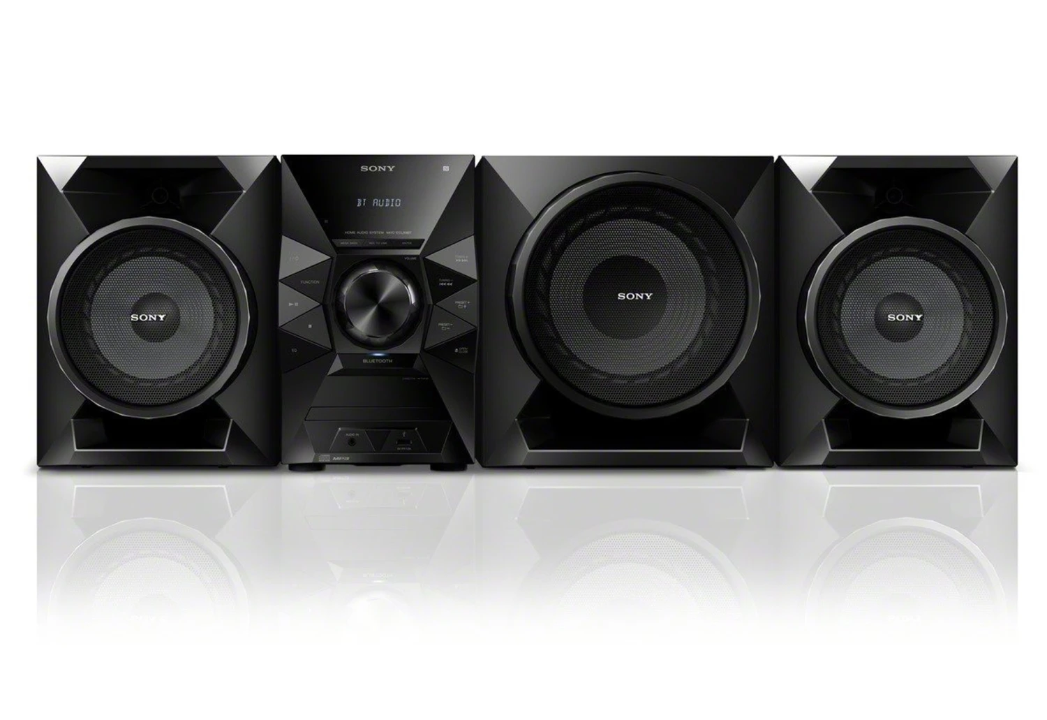 This robust Sony system has 700 watts, two speakers, and a separate subwoofer. Each can be mounted wherever you like. Booming Bass fills up even large rooms. Plays CD’s and has an AUX input jack for MP3 players or phones, as well as a USB input.