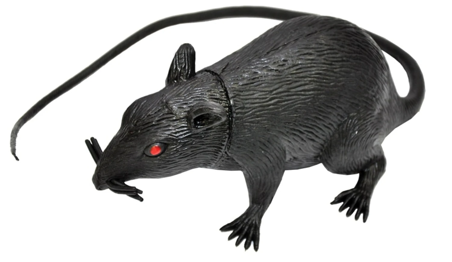 5 inch vinyl realistic-looking rat with squeeky sound. Tail is 11 inches long.