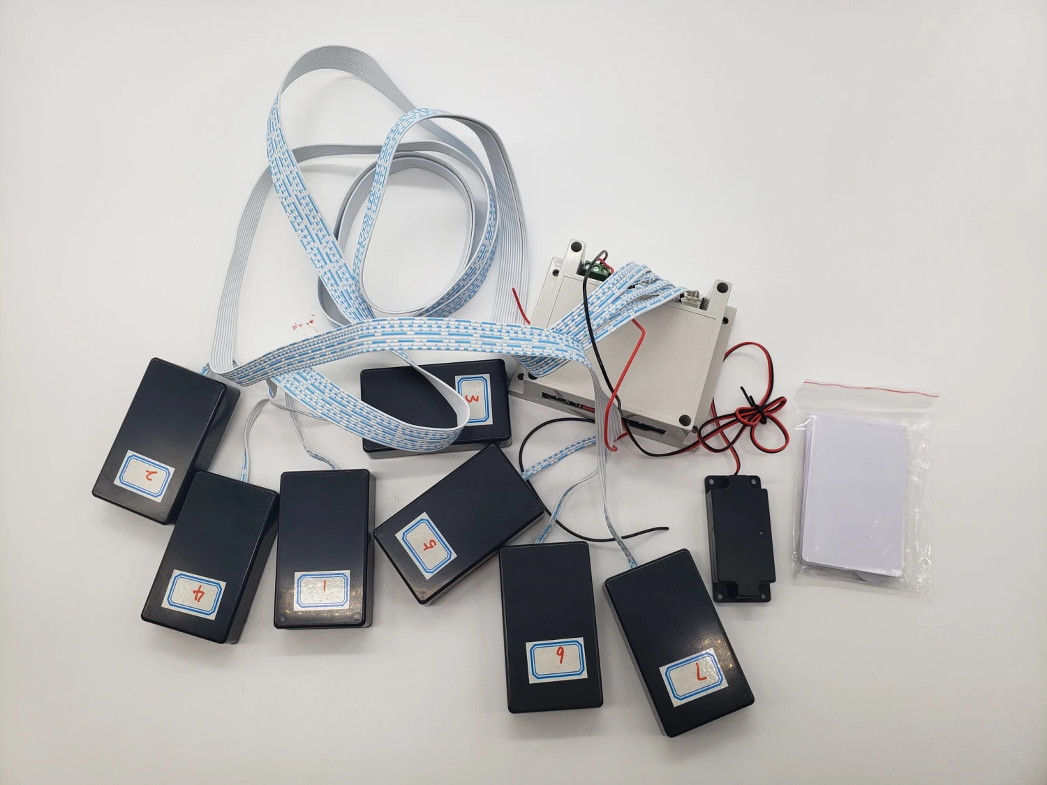 Players must find seven magnetic keycards. When each of the cards is placed in a special spot in the room, the prop will trigger an electronic lock (or turn on a light or motor or start any other 12-volt prop).