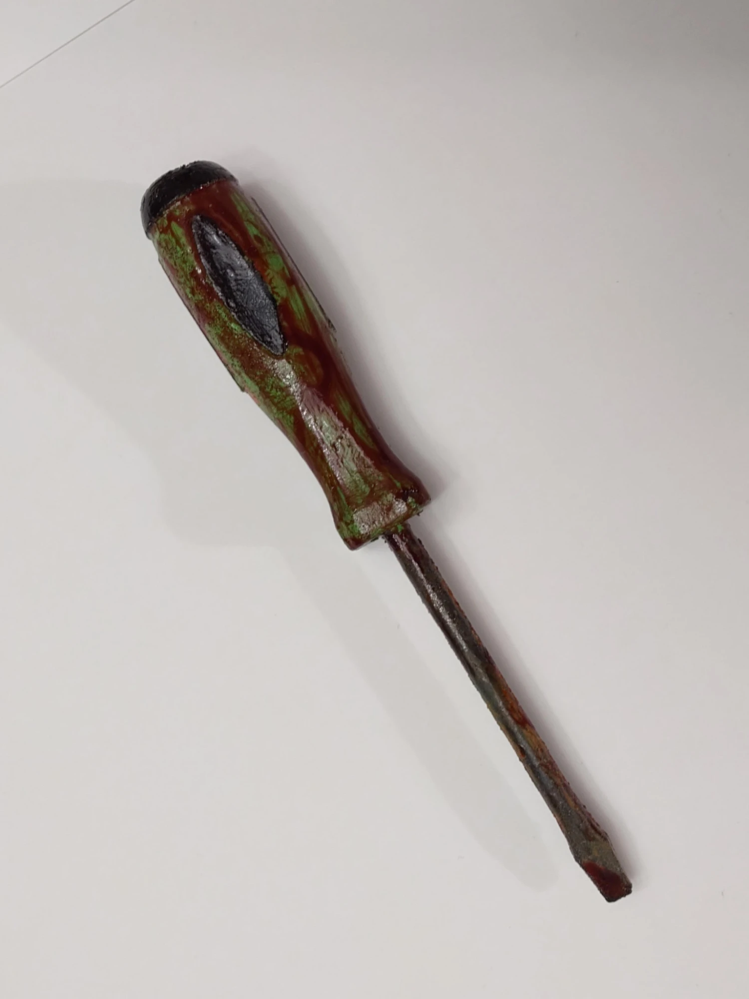 The small screwdriver is made of foam with a dowel rod inside for structure. It is painted and has special effects blood applied. Perfect for a professional haunter or someone looking for a finishing touch on a Halloween costume. These bloody, gory fake weapons will not disappoint!  Â